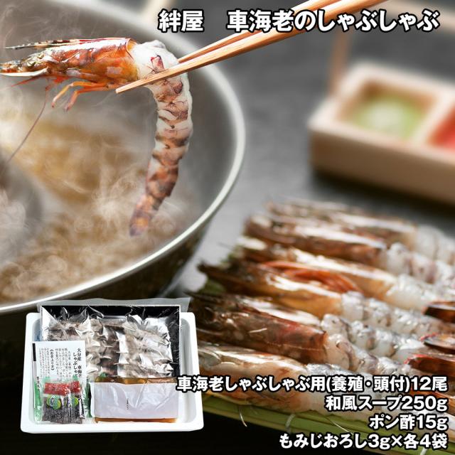 ■規格:車海老しゃぶしゃぶ用(養殖・頭付)12尾、和風スープ250g、ポン酢15g・もみじおろし3g×各4袋