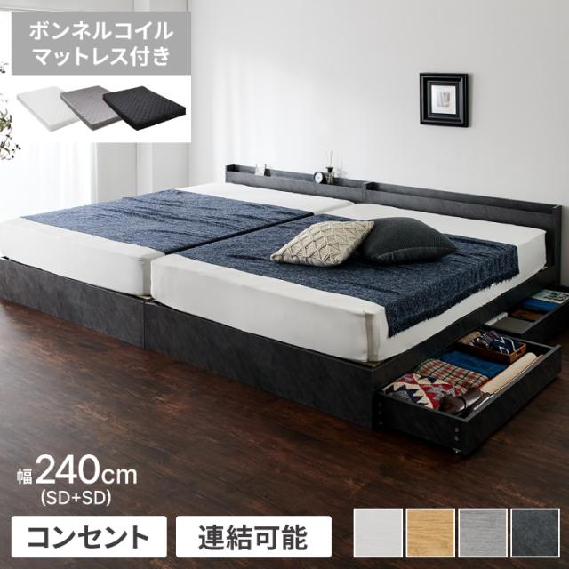 ファミリーベッド 収納ベッド ワイドキング240(SD+SD)ボンネルコイルマットレス付き ベッド 収納付き ベッドフレーム 2口コンセント付き 連結ベッド すのこベッド 宮棚 引き出し付き マットレス付き(代引不可)【送料無料】