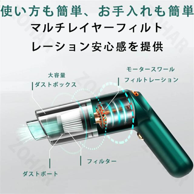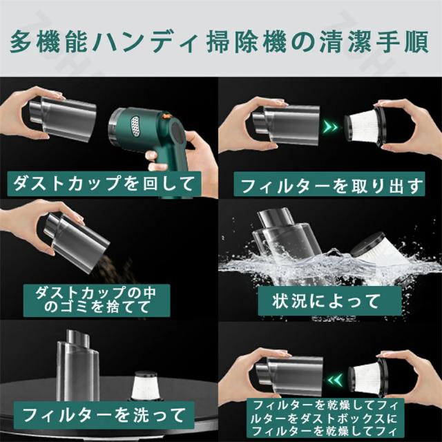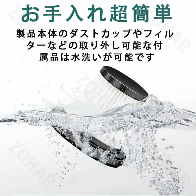 ハンディ掃除機は、1回のひねりで簡単にホコリやゴミを出すことができるビジュアルダストバケツを採用しています。フィルターは洗えるので、環境にやさしく再利用できます。