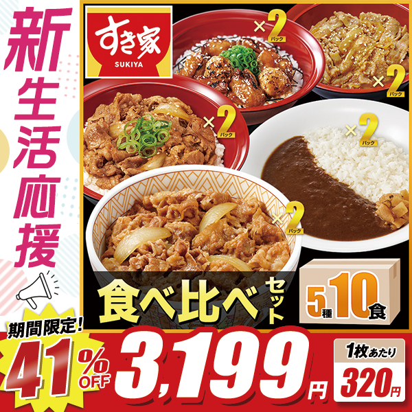| 内容量 | 各2パック、合計10パック入り 『すき家 牛丼の具120g』『すき家 牛カルビ丼の具120g』『すき家 豚生姜焼き丼の具120g』・・・1パック当たり120グラム 『すき家 炭火やきとり丼の具125g』・・・ 1パック当たり125グラム 『すき家 横濱カレー220g』・・・1パック当たり220グラム |