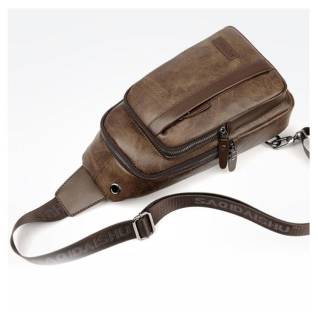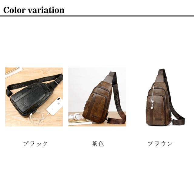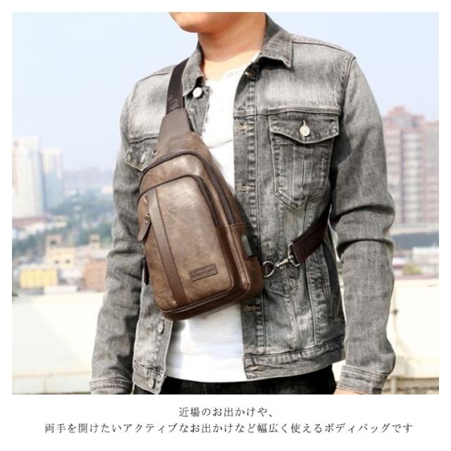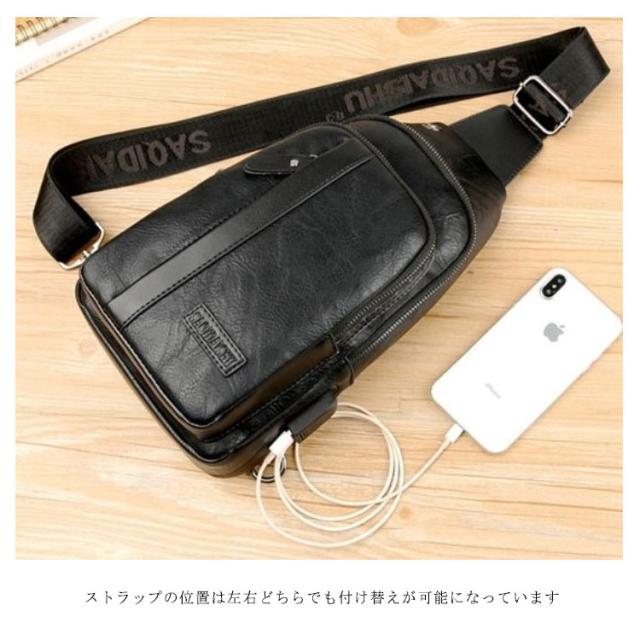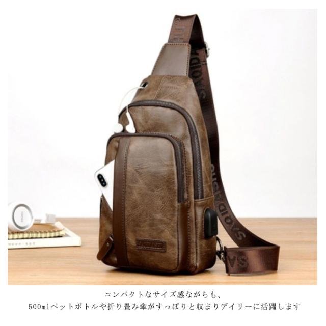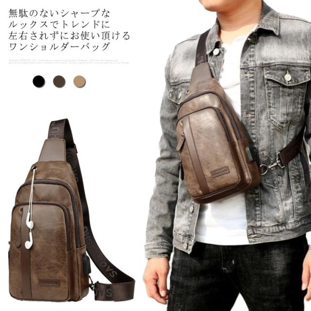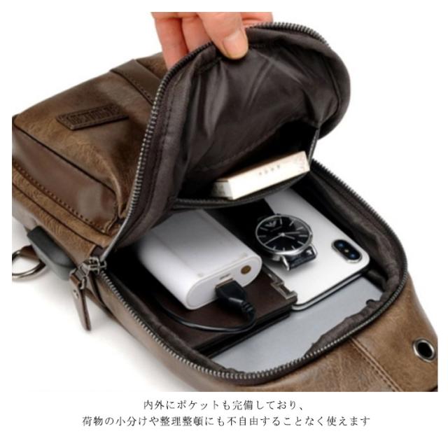 【送料無料】ボディバッグ ワンショルダーバッグ メンズ PU革 ショルダー USBケーブル 携帯充電 撥水 斜めがけ 小さめ かっこいい 大容量 旅行 通勤 通学 自転車 ボディーバック 普段使い おしゃれ シンプル ブラック 黒 茶色 ブラウン