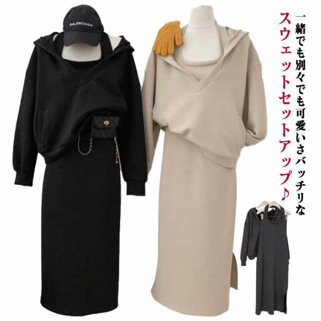 セットアップ レディース 春秋 長袖バーカー ワンピース スウェット パーカー 春夏 カジュアル スカートセットアップ シンプル 無地 ロング丈 スポーツ風 ジャージー ルームウェア 部屋着 3色 韓国風