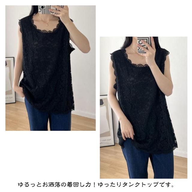 | M-3XL!総レースタンクトップ。 ゆるっとお洒落の着回し力!ゆったりタンクトップです。 レイヤードしてもごわつきにくく、いつものコーディネートにプラスするだけで、簡単におしゃれなレイヤードスタイルが完成します。 | |