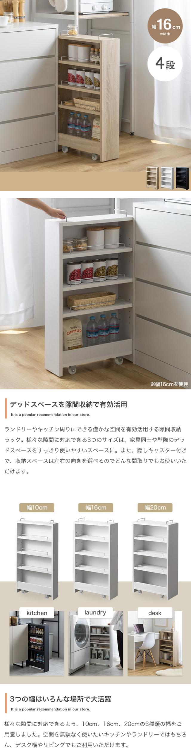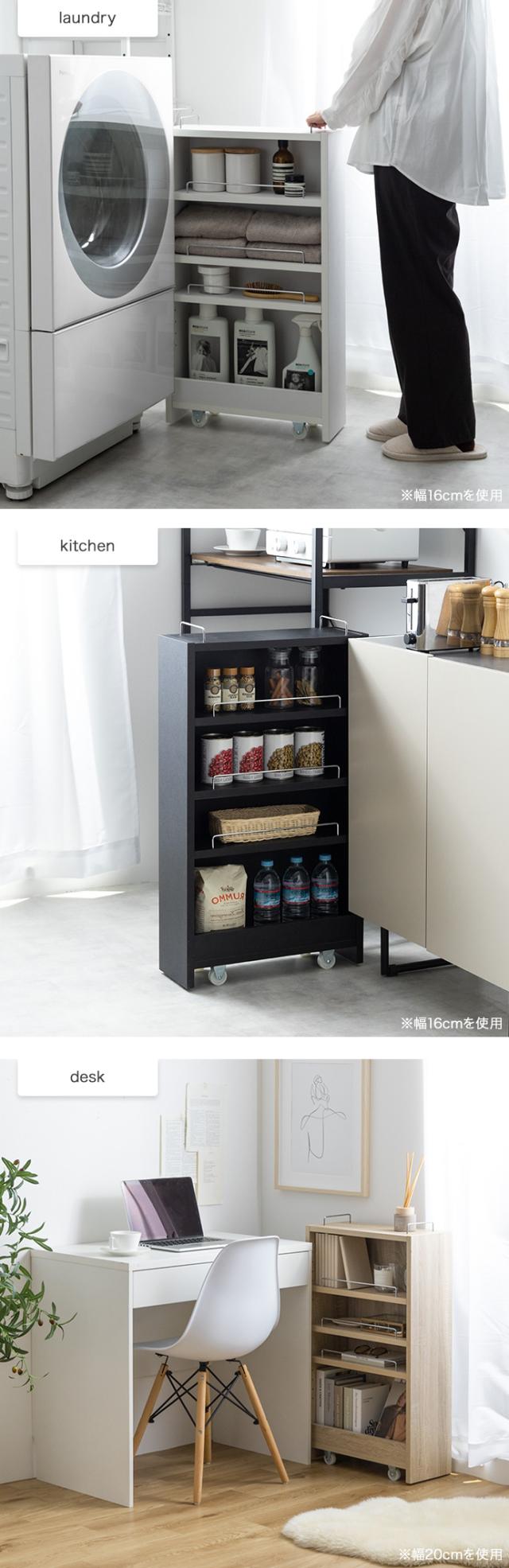 ランドリーやキッチン周りでできる僅かな隙間にぴったりフィットし、見た目もすっきりと使いやすいスペースに。
