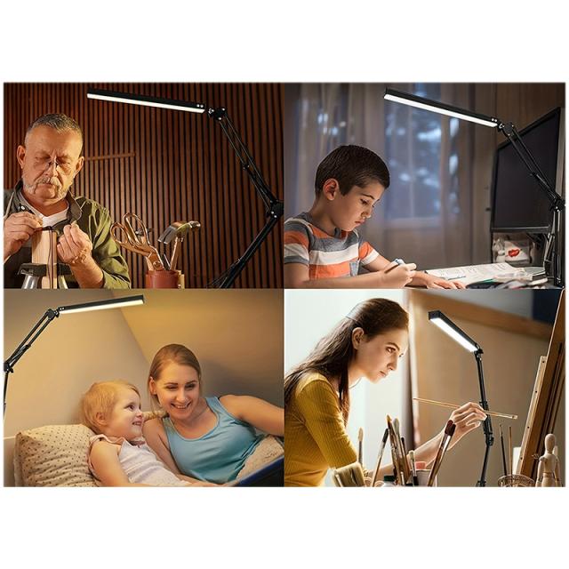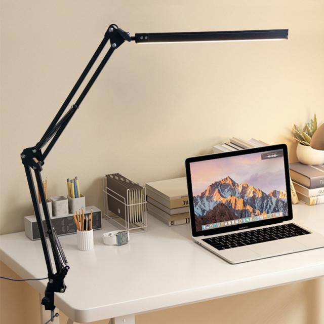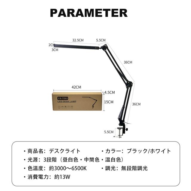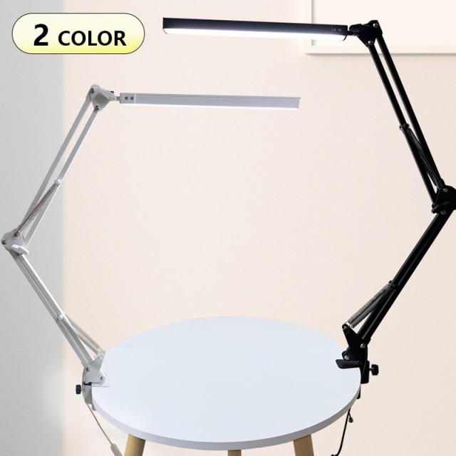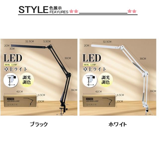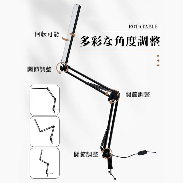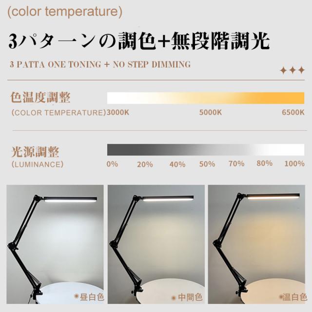 クランプ取り付けで、机に挟み込んで設置。ロングアームを採用し、デスクライト光源LED部も長く、広範囲に明るく照らすことが可能。900ルーメンで色温度も光源も無段階で調整可能。3関節のクランプLEDライト