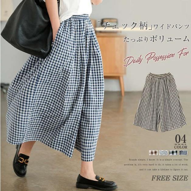 ワイドパンツ パンツ レディース 春夏 スカーチョ ウエスト ゴム ギンガムチェック ボトムス チェック 楽ちん ワイド クロップド丈 大きいサイズ