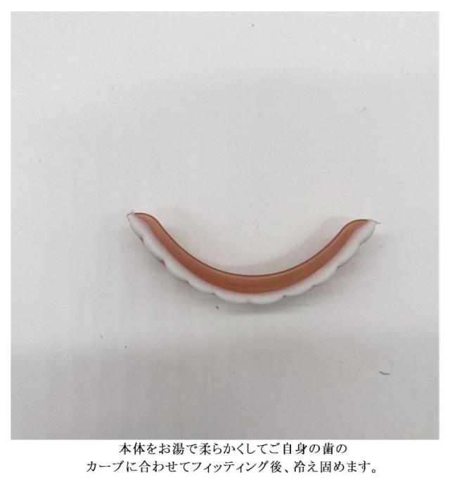 | サイズについての説明 | 【使用方法】1.約80度のお湯の入ったカップにティースを1分程入れます。2.湯で柔らかくなった本体を取出してご自身の前歯のカーブに合わせてフィッティングします。3.約5分後、冷え固待ったティースをゆっくりと外し、完全に硬化後にご使用開始となります。※フィッティングはリセット可能ですのでやり直し出来ます。※上歯用は本体裏側に特製具材がセットされていますので、ワンタッチでフィッティングできます。※下歯用は別途接着剤(ビーズ具材)が同梱されています。お湯で温めてから、本体のくぼみに埋め込んでフィットさせて下さい。市販の入れ歯安定剤を併用すると更にフィット性が向上いたします。【お手入れ方法】通常は水洗い、汚れが気になってきた場合は市販の入れ歯洗浄剤をご使用下さい。 |