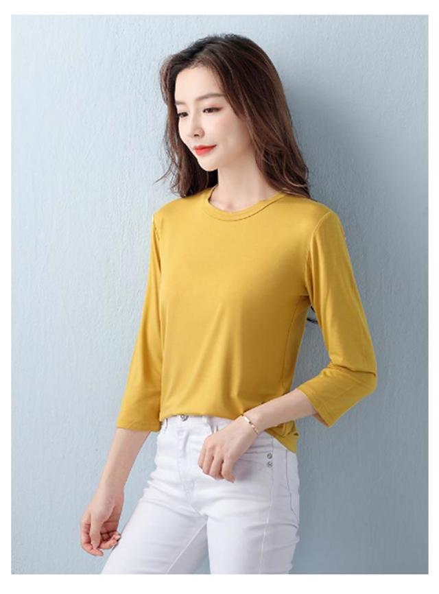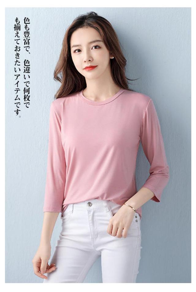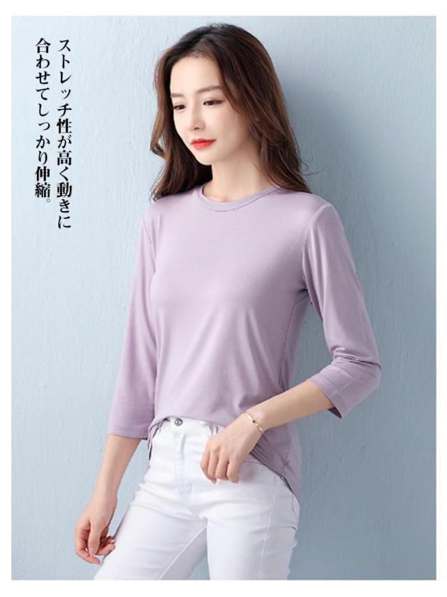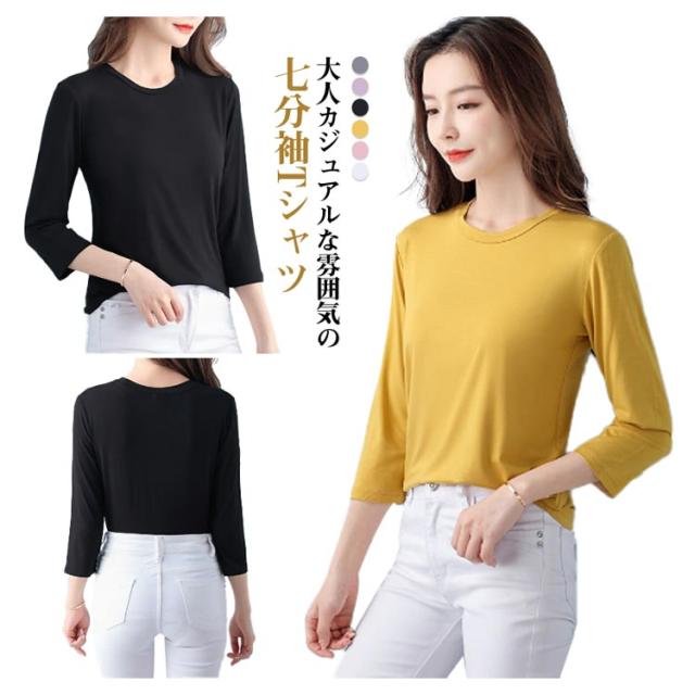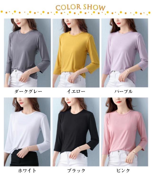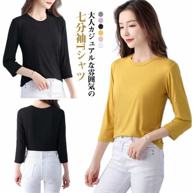 カットソー 7分袖 レディーストップス 夏秋 Tシャツ 七分袖 ロングtシャツ プルオーバー 着?せ 丸首 重ね着 無地 シンプル カジュアル 大きいサイズ 春 夏 薄手 tシャツ 送料無料 ダークグレー パープル ブラック イエロー ピンク ホワイト