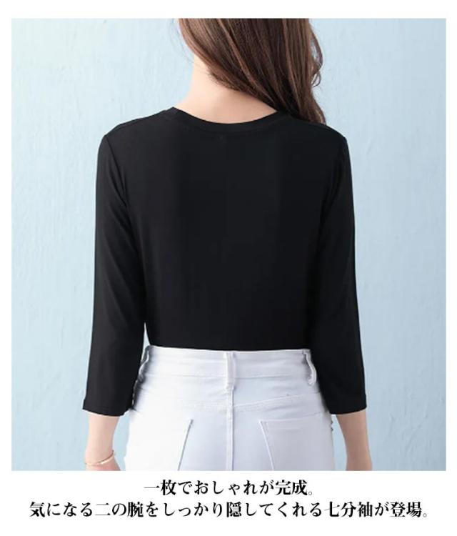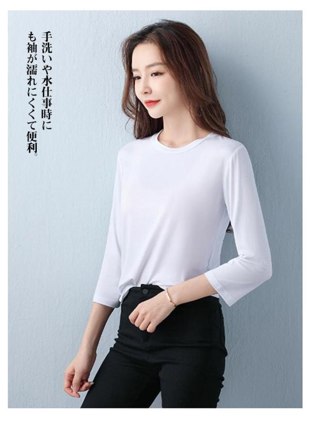 | 大人カジュアルな雰囲気の七分袖Tシャツ。 一枚でおしゃれが完成。気になる二の腕をしっかり隠してくれる七分袖が登場。 手洗いや水仕事時にも袖が濡れにくくて便利。 ストレッチ性が高く動きに合わせてしっかり伸縮。 色も豊富で、色違いで何枚でも揃えておきたいアイテムです。 | |