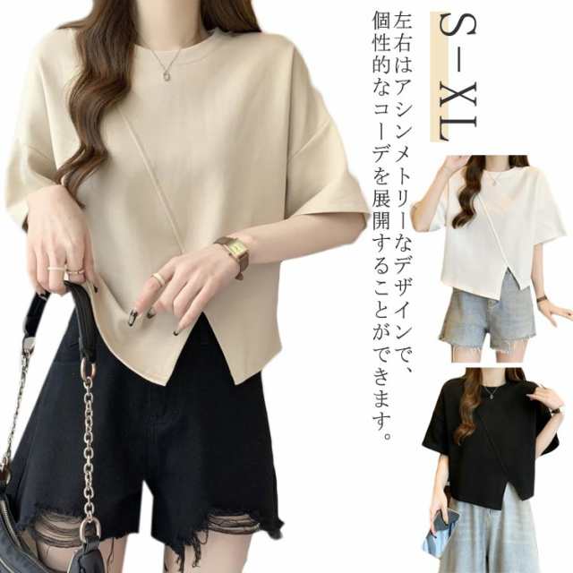 二の腕カバー 半袖 カットソー 半袖 スリット 着痩せ レディース トップス 変形 無地 シンプル カジュアル アシンメトリー Uネック ラウンドネック 白 Tシャツ 黒 春 夏 洗える