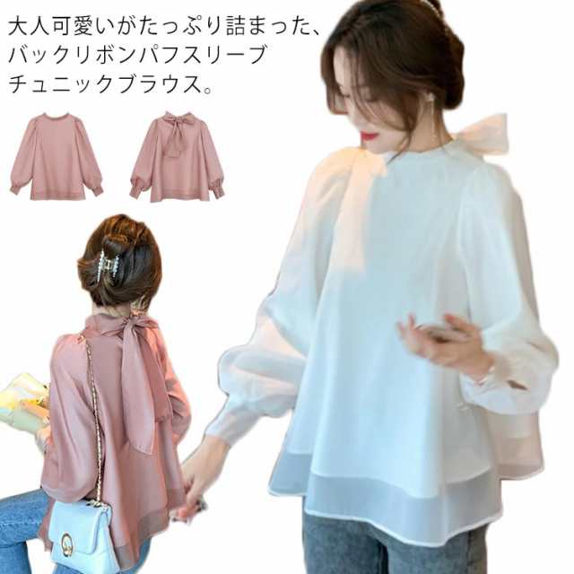 ブラウス 長袖 レディース バックリボン ハイネック チュニック ふんわり 背中リボン 上品 パフスリーブ トップス 無地 ゆったり シフォン 清楚 チュニックブラウス ピンク フリル 結婚式 ボリューム袖 春夏 白 フレア ホワイト 可愛い