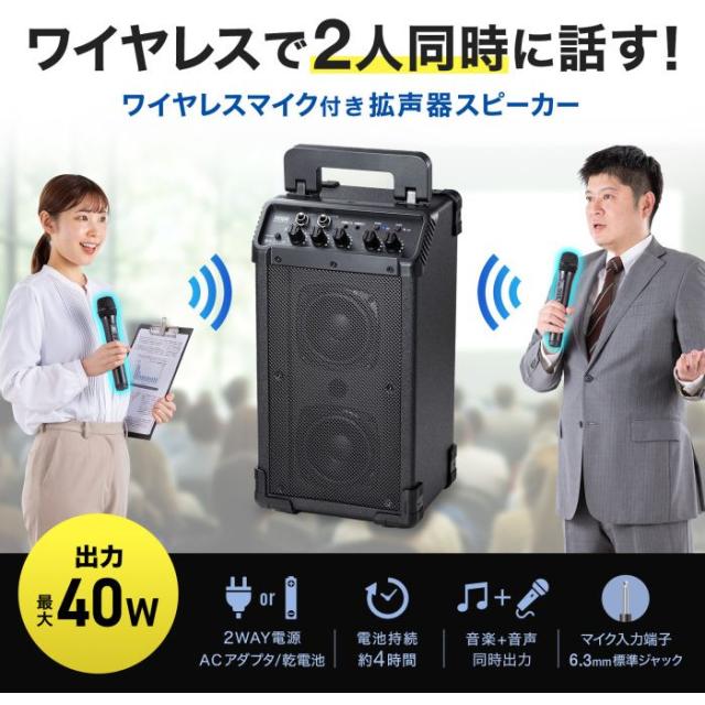 最大40W出力の拡声器スピーカー!ワイヤレスマイク2本対応で会議やイベントに最適。ACアダプタ・乾電池両対応、大型ハンドル&収納バッグ付き。