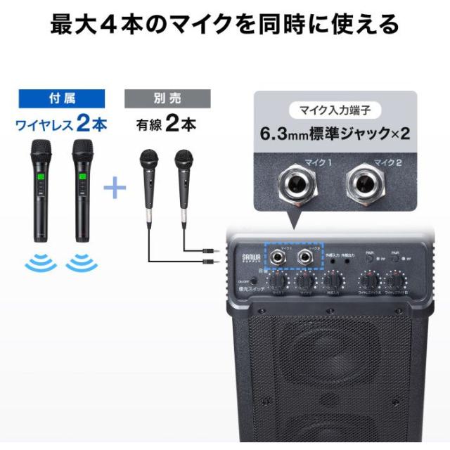 ●ワイヤレスマイク2本を同梱しており自由に移動しながらの同時使用が可能です。別売りの有線マイクを追加することで最大4本のマイクを同時利用することが可能です。