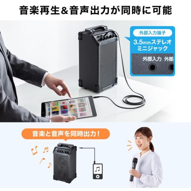 ●外部音声入力を搭載しており、音楽再生も可能です。同時にマイク音声出力もできます。カラオケスピーカーとして利用したり、結婚式の2次会やパーティーなどにバックミュージックと共にアナウンスを流したりできます。