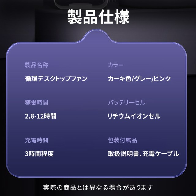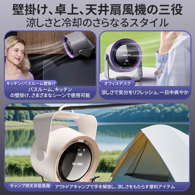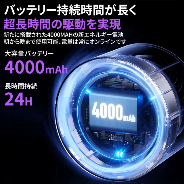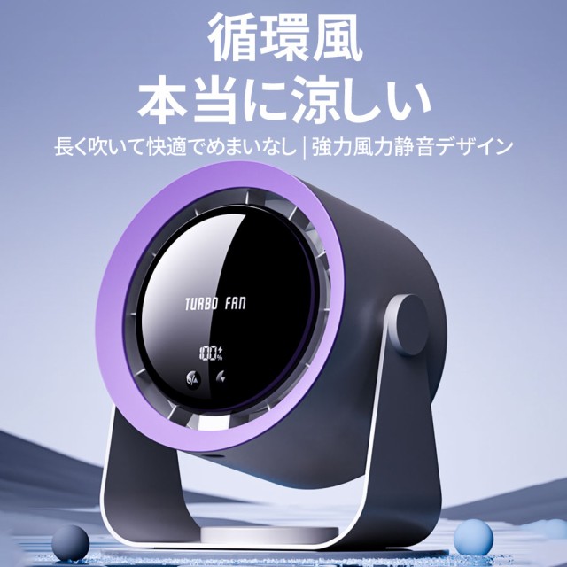 パワフルな風量と静音設計を兼ね備えた、小型ながら高性能なデスクファンです。4000mAhの大容量バッテリーを搭載し、コードレスで使用できるため、オフィスや自宅はもちろん、アウトドアやキャンプなどでも大活躍。
