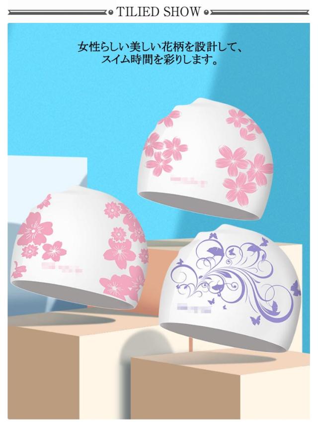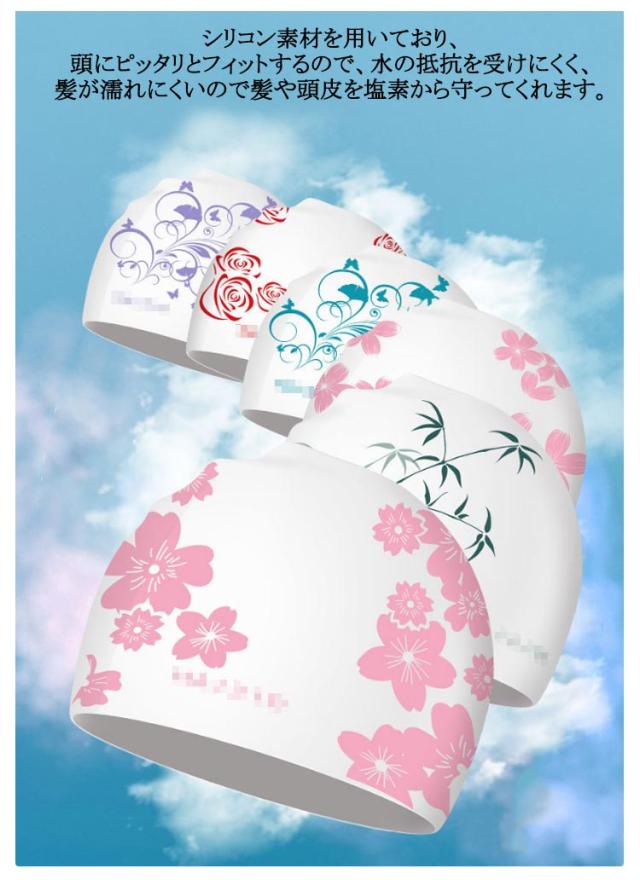 | 塩素から髪の毛を守るシリコンスイムキャップ 伸縮性抜群なので、髪の毛が長い方でも、まとめて帽子にスマートに収まります。 シリコン素材を用いており、頭にピッタリとフィットするので、水の抵抗を受けにくく、髪が濡れにくいので髪や頭皮を塩素から守ってくれます。 女性らしい美しい花柄を設計して、スイム時間を彩りします。 水中ウォーキングなどのトレーニングや、キッズスイミングの付き添い、ベビースイミングなど、普段のプールで大活躍! | |