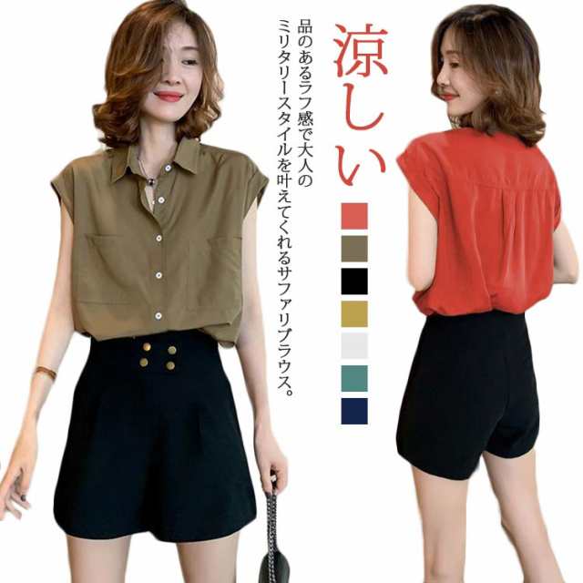 ブラウス オフィスカジュアル 胸ポケット レディース フレンチスリーブ 袖なし 襟付き シャツノースリープ ミリタリー シャツブラウス ボーイッシュ 送料無料 サファリシャツ 春 夏 半袖 シャツ ロールアップスリーブ トップス