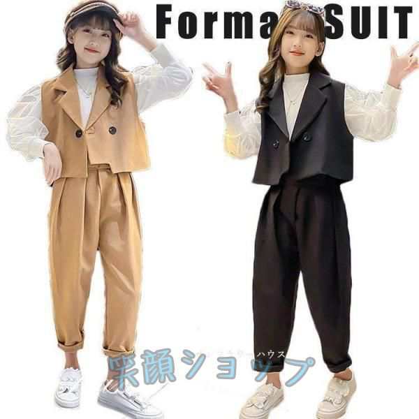 卒業式 パンツスーツ 女の子 フォーマルスーツ パンツスーツ セットアップ ピアノ発表会 キッズ tシャツ ベスト パンツ ブラック カーキ 韓国子供服 3点セット フォーマルスーツ 発表会 七五三 卒園式 韓国ファッション 大きいザイズ 120 130 140 150 160 170
