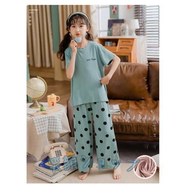 ジュニア 女の子 パジャマ 上下3点セットアップ 半袖Tシャツ+長ズボン+ハーフパンツ 女子 ルームウェア 薄手 上下別柄 水玉 無地 カジュアル やわらか