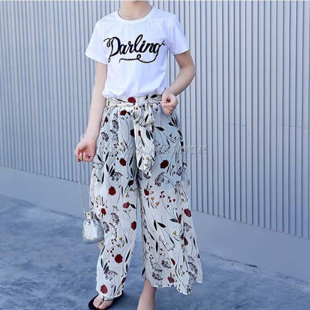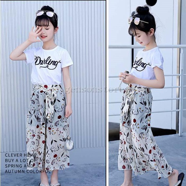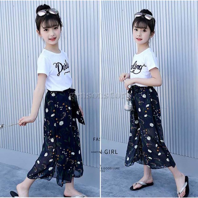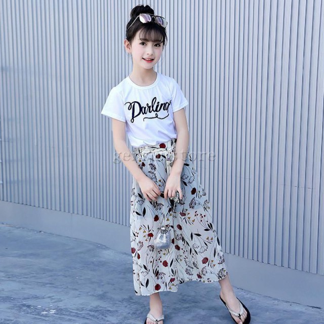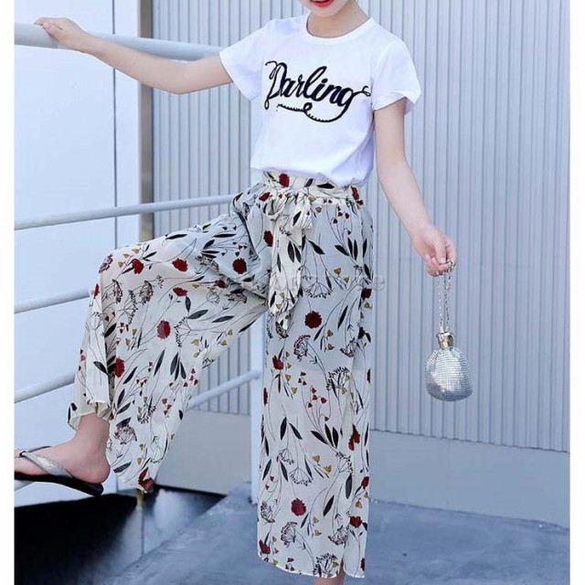 子供服 女の子 キッズ シフォン ロングパンツ ボトムス ガウチョパンツ 花柄 可愛い おしゃれ フレア リボン付き クロップドパンツ 7分丈 春夏 通学 コーデ