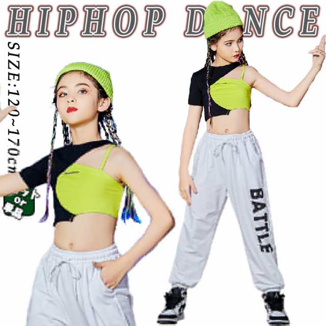 キッズダンス衣装 セットアップ 肩だし トップス ショート丈 トップス へそ出し 黄緑 ベスト 派手 白 パンツ ロングパンツ スウェット パンツ 普段着 チアガール K-POP 韓国 かっこいい 演出服 舞台服 練習着 ストリート ステージ 普段着 子供服