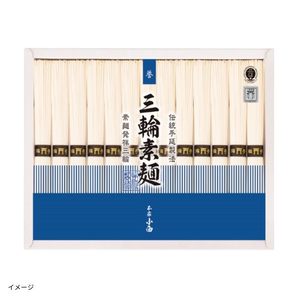 内容量: 50g×13/セット | 原材料名: 小麦粉(国内製造)、食塩、食用植物油 ※本品製造工場では、そば、ごまを含む製品を製造しています。 | 栄養成分: (100g当たり)エネルギー:336kcal、たんぱく質:11.1g、脂質:1.5g、炭水化物:69.4g、食塩相当量:5.9g | 保存方法: 直射日光及び高温多湿を避けて保存してください。 | 調理方法: ゆで時間は1分半〜2分を目安 | 販売者の名称及び住所: 株式会社三輪そうめん小西奈良県桜井市大字巻野内196番地