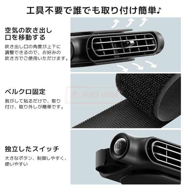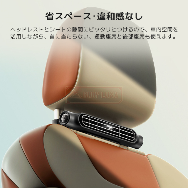 | 【背中スッキリ】 | ◆夏場の暑い車座席に設置して、背中に送風できる車用クールファンが登場!体積が小さくて空間を占めなくて、車内において邪魔になりません。ヘッドレストに取り付けることで、背中や頭をシートにつけても本体が首に当たることなく使用することができます。この扇風機とエアコン併用すれば冷房効率をアップでき、涼しい雰囲気を与えます。 |