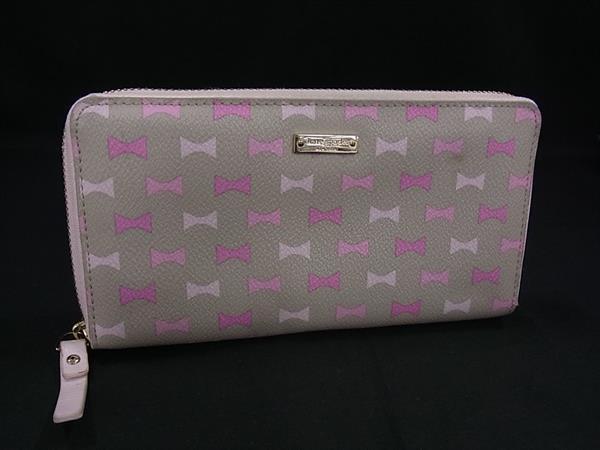 ■美品■ kate spade ケイトスペード PVC リボン柄 ラウンドファスナー 長財布 ウォレット 札入れ 小銭入れ グレージュ系 DH6657