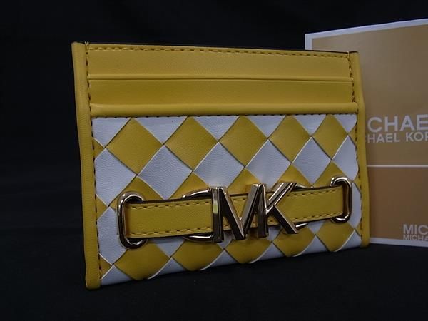 ■新品同様■ MICHAEL KORS マイケルコース レザー 編み込み カードケース カード入れ イエロー系×ホワイト系 BL4070