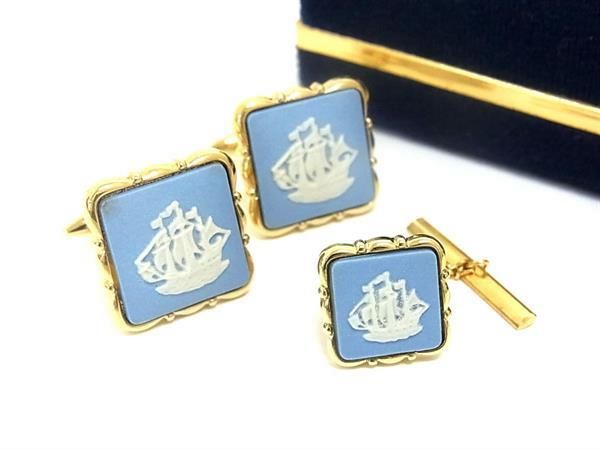 ■美品■ WEDGWOOD ウェッジウッド ジャスパー カメオ カフス カフリンクス ネクタイピン 2点セット ブルー系×ゴールド系 DF9499