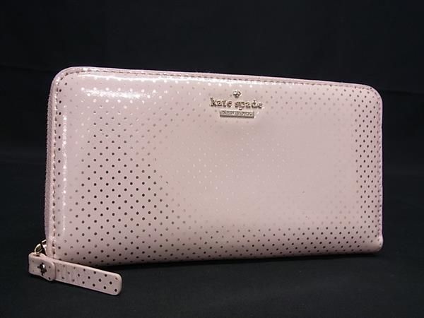 ■美品■kate spade ケイトスペード レザー ドット柄 水玉 ラウンドファスナー 長財布 ウォレット レディース ライトピンク系 DF7064