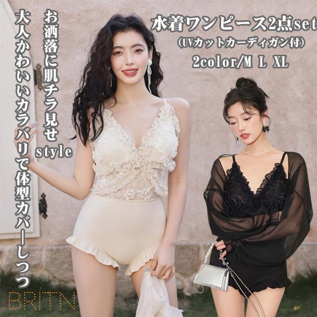 水着 レディース 体型カバー ワンピース リゾート 袖付き ワンピース水着 カーディガン 2点セット オトナ女子 かわいい おしゃれ ママ水着 20代 30代 40代