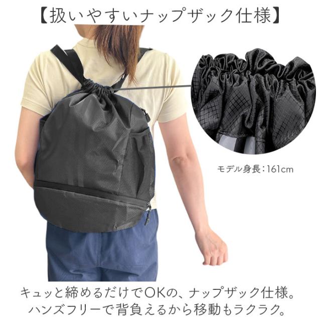 | 商品説明 | 【濡れた服も収納できる!】 ・ジムバッグ、レジャー、習い事やプールに!「撥水ナップサック」が登場。 【濡れた衣類やタオルも収納OK!】 ・水濡れや汗で濡れた衣類の収納もOKな内側撥水生地!突然の雨でも安心の外側も撥水加工をON。 (※)撥水機能は完全に防水するものではありません。 【底部の独立収納がポイント】 ・靴などの分けて入れたい荷物を入れられる収納を搭載。ジムや習い事バッグにぴったり! 【仕切りポケットで整理整頓】 ・メイン収納には、撥水生地を使った仕切りポケットを搭載。荷物を整理しやすい作り。 【扱いやすいナップザック仕様】 ・キュッと締めるだけでOKの、ナップザック仕様。ハンズフリーで背負えるから移動もラクラク。 【男女兼用、お子様も大人も使える!】 ・スポーティーデザインなので、性別年齢関係なく使える!お子様の部活や林間学校などにも♪ 【ポケット仕様】 ・底部:ファスナーポケット×1 ・メイン収納:仕切りポケット×1、ファスナーポケット×1 ・サイド:オープンポケット×2 |