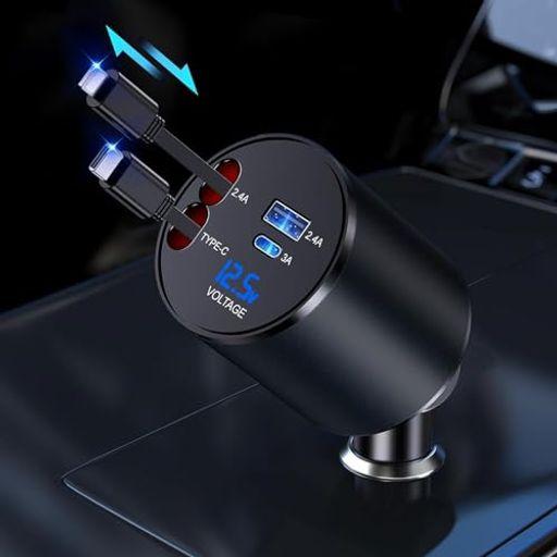 GLILAVOX シガーソケット USB-C 巻き取り 車 充電器 60W 急速充電 80CM TYPE-C/ライトニング ケーブル USB ポート 4IN1 カーチャージャー 電圧測定 車載充電器 多重保護 4台同時 COMPATIBLE WITH