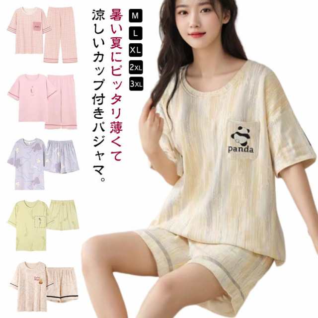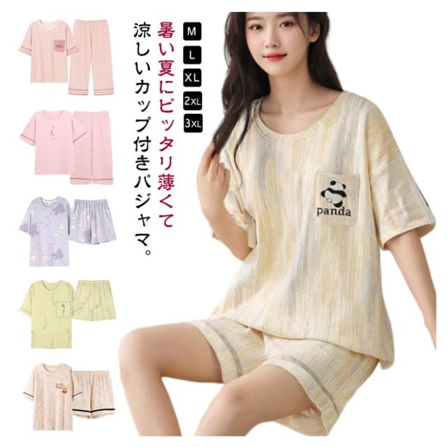 カップ付き パジャマ 接触冷感 パジャマ ルームウェア レディース 半袖 ショートパンツ/七分丈パンツ 2点セット 上下セット 涼しい 無地 部屋着 上下セット 寝巻き 夏 ゆったり 可愛い 大きいサイズ ナイトウェア モダール リラックス 入院用 お出かけ プレゼント ギフト