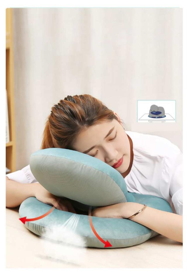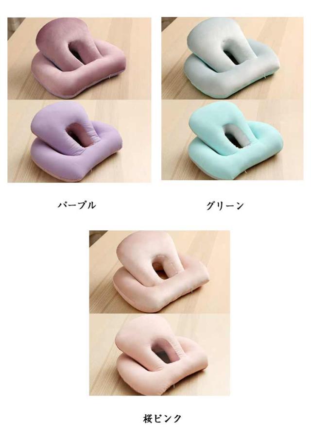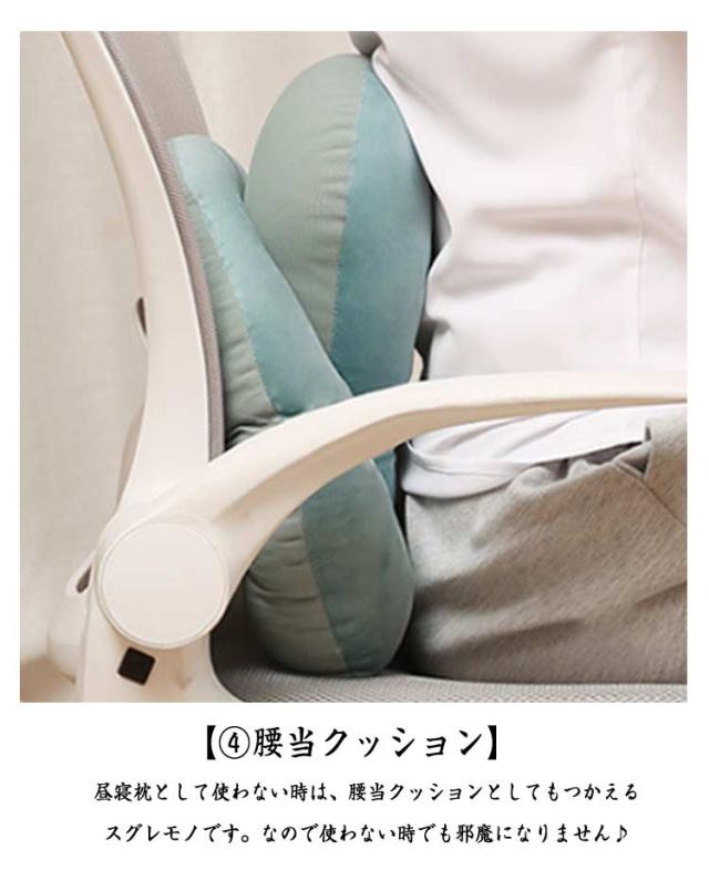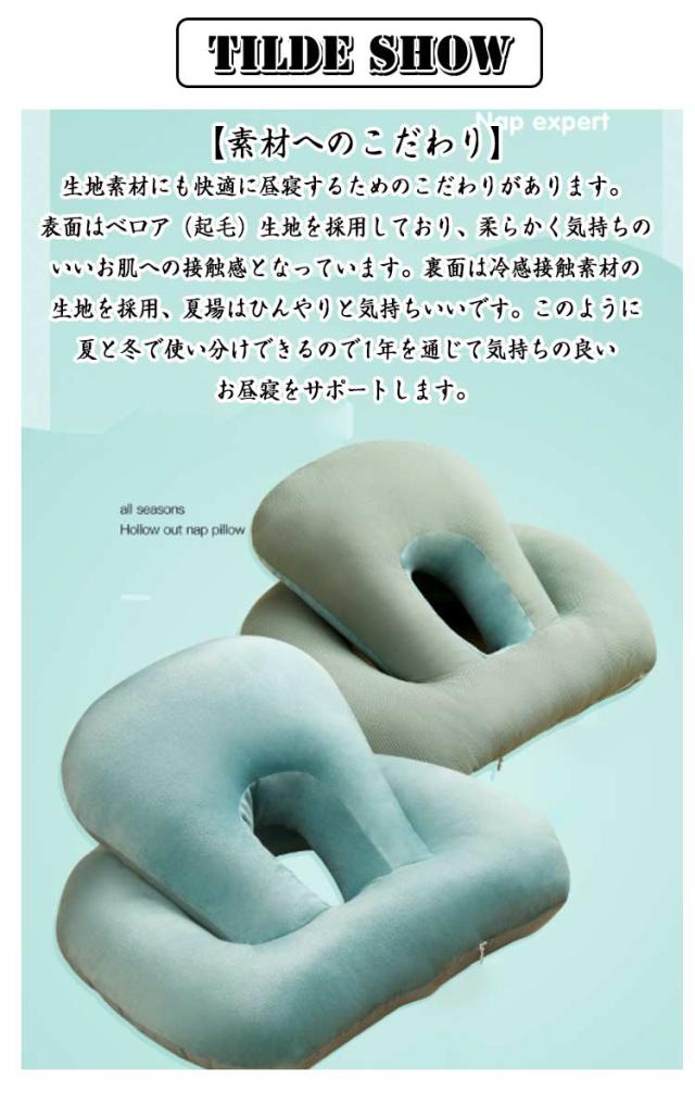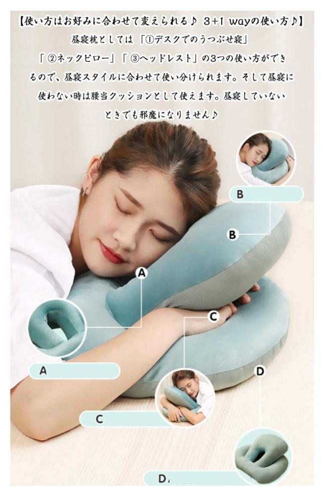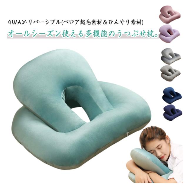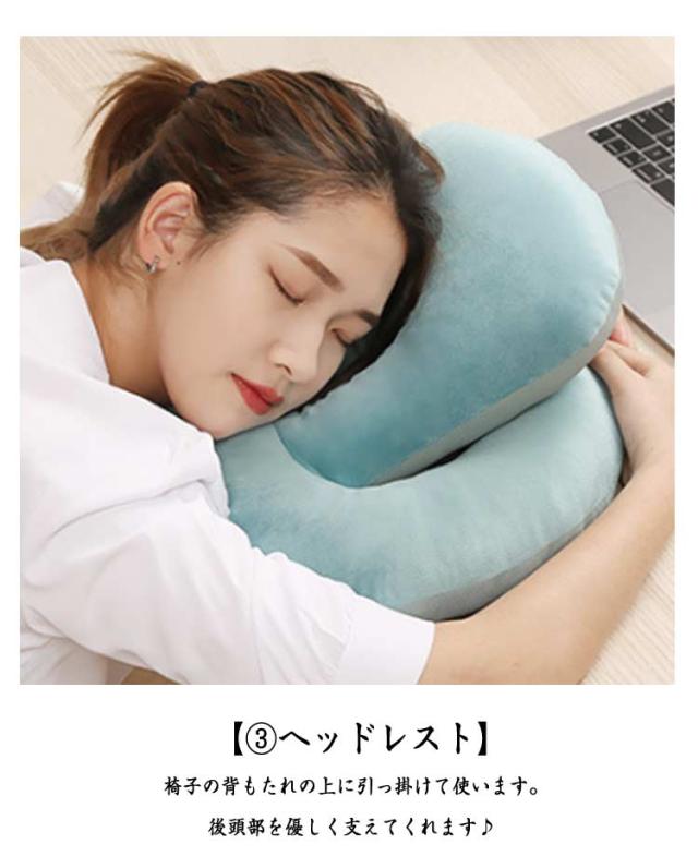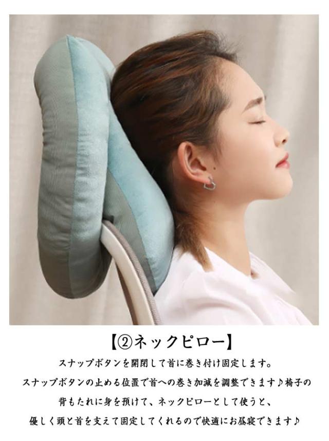 | 4WAY?リバーシブル(ベロア起毛素材&ひんやり素材)?オールシーズン使える多機能のうつぶせ枕。 【ちょっと休憩・お昼寝に最適♪】 机の上にこのうつ伏せ寝枕を置いて頭を乗せれば少しの時間でも快適に昼寝できます。起きて手や腕が痺れているということはありません。昼寝枕が頭の重さをしっかりと吸収してくれます。 お仕事の合間のほんの少し仮眠をとりたい時に便利な机枕なんです。 素材は軽く、持ち運びにも便利。長時間のお車のお出かけのお供にもおススメのお昼寝枕です。 【使い方はお好みに合わせて変えられる♪ 3+1 wayの使い方♪】昼寝枕としては 「1.デスクでのうつぶせ寝」「 2.ネックピロー」「 3.ヘッドレスト」の3つの使い方ができるので、昼寝スタイルに合わせて使い分けられます。そして昼寝に使わない時は腰当クッションとして使えます。昼寝していないときでも邪魔になりません♪ 【1.うつ伏せ寝枕】机の上にネックピローを置いて、腕は枕を抱え込むようにします。頭部・顔面部が接触するクッション部はドーナッツ状になっているので、口・鼻からの呼吸がしやすい設計です♪ 【2.ネックピロー】スナップボタンを開閉して首に巻き付け固定します。スナップボタンの止める位置で首への巻き加減を調整できます♪椅子の背もたれに身を預けて、ネックピローとして使うと、優しく頭と首を支えて固定してくれるので快適にお昼寝できます♪ 【3.ヘッドレスト】椅子の背もたれの上に引っ掛けて使います。後頭部を優しく支えてくれます♪ 【4.腰当クッション】昼寝枕として使わない時は、腰当クッションとしてもつかえるスグレモノです。なので使わない時でも邪魔になりません♪ 【素材へのこだわり】生地素材にも快適に昼寝するためのこだわりがあります。表面はベロア(起毛)生地を採用しており、柔らかく気持ちのいいお肌への接触感となっています。裏面は冷感接触素材の生地を採用、夏場はひんやりと気持ちいいです。このように夏と冬で使い分けできるので1年を通じて気持ちの良いお昼寝をサポートします。 | |