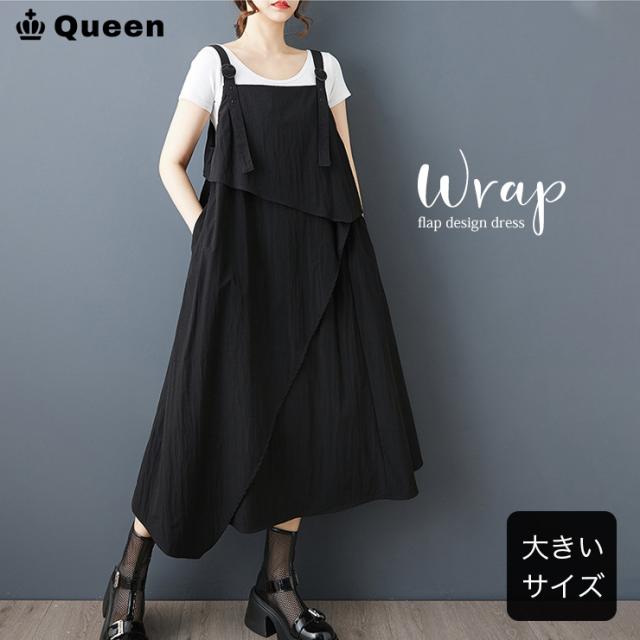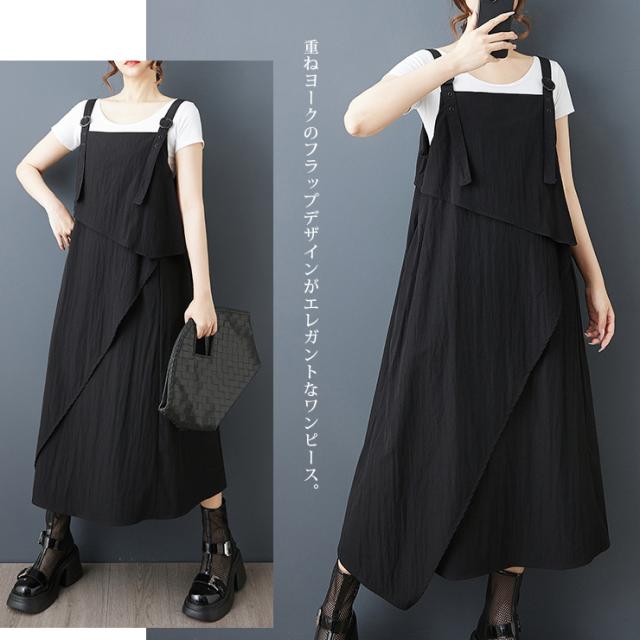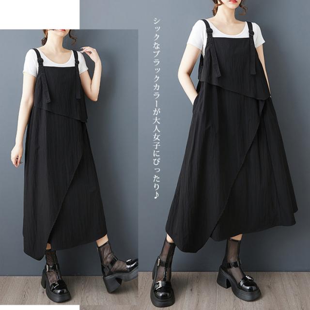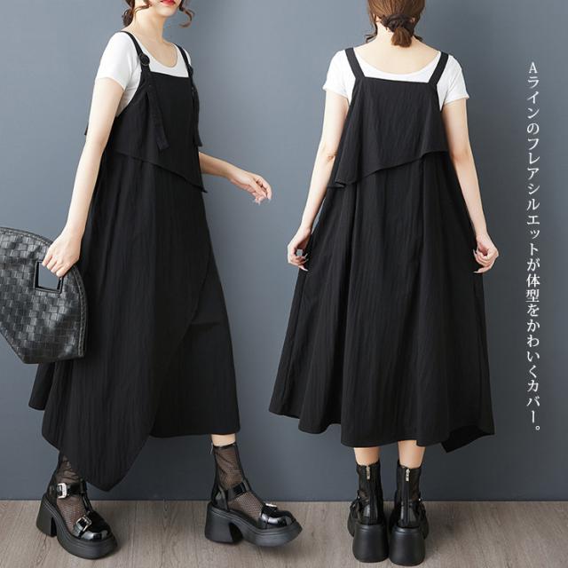 ★☆ワンピース 大きいサイズ ジャンパースカート アシンメトリー フレア ロング丈 黒 サロペット モード系 LL 3L 4L 5L 6L 体型カバー ゆったり 春夏 重ね着 レイヤード☆★