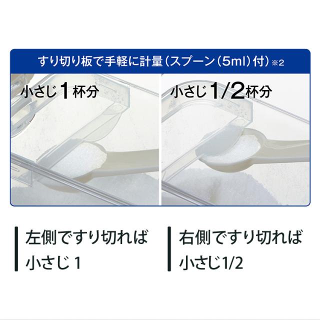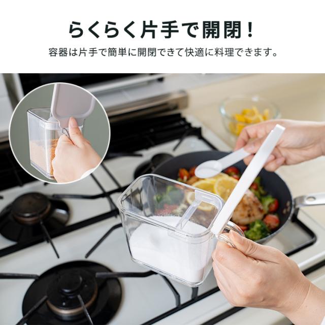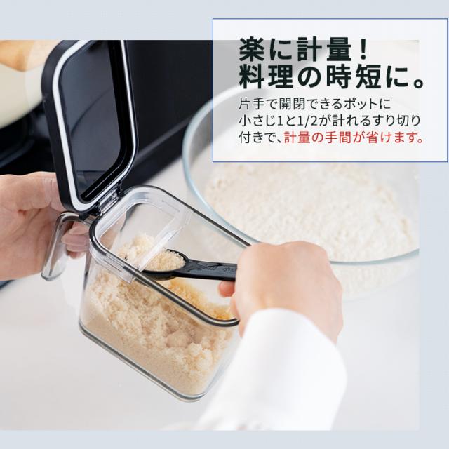 お料理の際の塩や砂糖の計量に便利な調味料ポット。計量スプーン付き、すり切り板を使えば、小さじ1、小さじ1/2の計量も簡単にできます。自宅のキッチンに合わせて選べるカラー展開。容量 : 480mlサイズ : 幅7.0×奥行14.0×高さ10.4cm材質 : 本体・フタ=ポリスチレン すり切り板・スプーン=ポリプロピレン パッキン=発泡PE