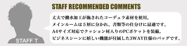 | ポケット | 【内 側】コンパートメント×5、背面クッションポケット×1 【外 側】ファスナーポケット×1、フロントファスナーポケット×1(内側:ファスナーポケット×1、オープンポケット×1、ペン差し×2)、キャリーオンベルト×1、サイドファスナーポケット×1 【付属品】ショルダーベルト×1 |