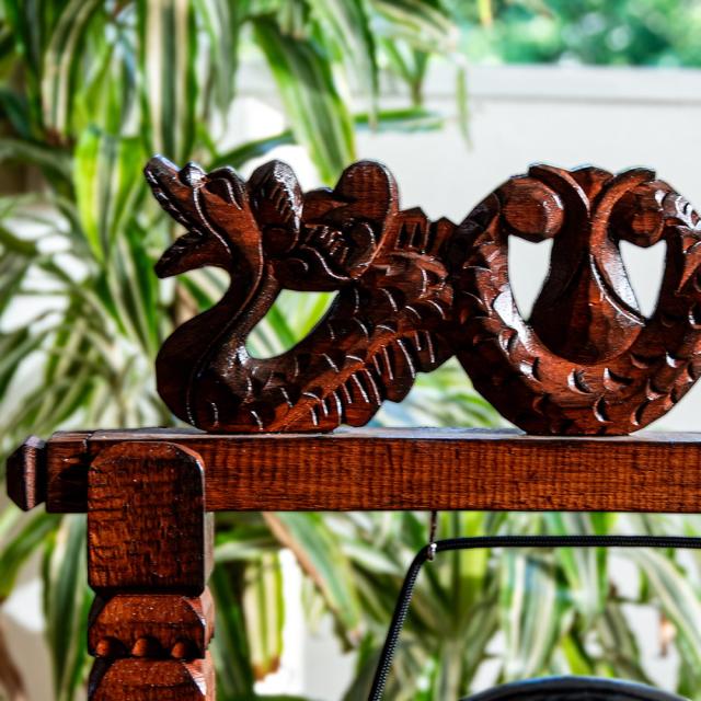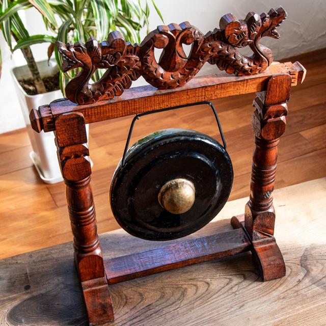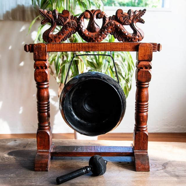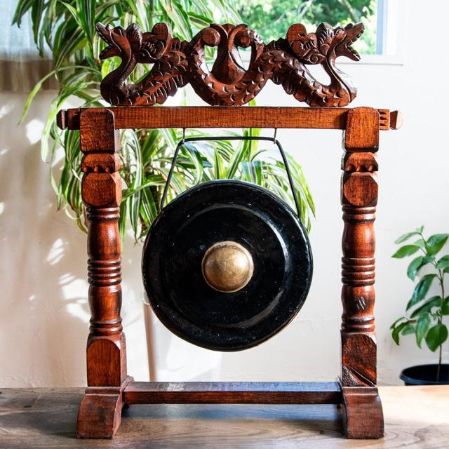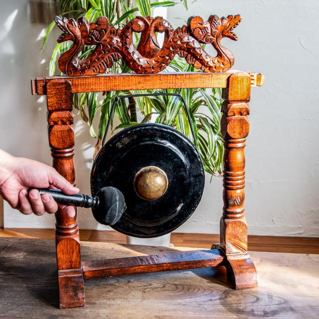 こちらはインドネシア・バリ島で作られた、伝統的なスタイルの吊るしゴングです。 ゴングは、バリの寺院や祝祭、舞踊などで神聖な音を響かせる重要な楽器。豊かな音の余韻とともに、人々の祈りやリズムを支えてきました。フレームには手彫りの装飾が施され、龍をモチーフにした精緻なデザインが目を引きます。見る角度によって表情が変わる木目の美しさと、アンティーク調の雰囲気が空間に落ち着きと異国情緒をプラスします。