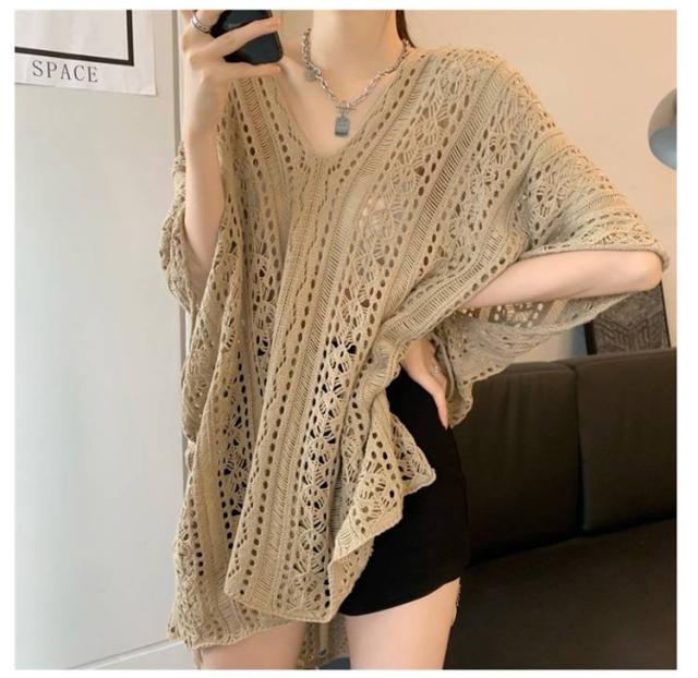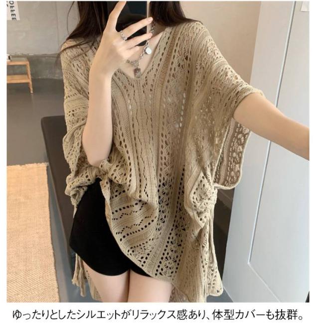 大きいサイズ 透かし編み ニット プルオーバーニット 薄手 シースルー サマーニット ニットソー ゆったり トップス Vネック 体型カバー 日焼け防止 ロング丈 ニット 透け感 夏服 紫外線対策 半袖 ドルマンシルエット 送料無料