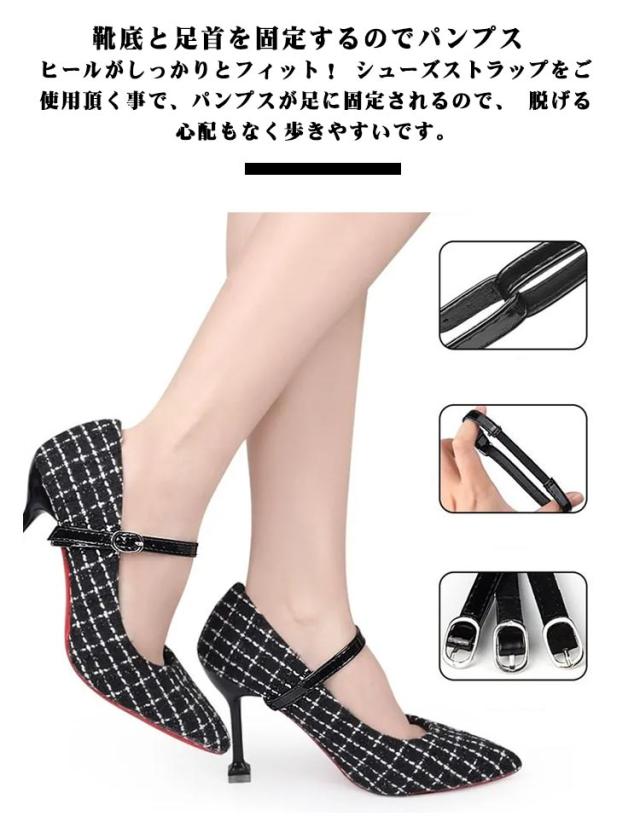 | なデザインのシューズストラップ左右2組セットです。 ヒールがパカパカするお悩みを解消できる便利アイテム! ? 靴底と足首を固定するのでパンプス ヒールがしっかりとフィット! シューズストラップをご使用頂く事で、パンプスが足に固定されるので、 脱げる心配もなく歩きやすいです。 ? ヒール部分にひっかけて足首を固定するので、足の甲で留めるゴムバンドタイプに比べて安定します。 歩くと脱げてしまいずっと履けなかったパンプスが大活躍! ? シューズストラップは、ベルト部分は数穴があり調整可能です。 ご自身の足や靴によってサイズを調整し、靴の脱落防止に役立ちます。 ? シューズストラップは高品質の皮革の材料で作られています。 滑り止め、伸縮性が良く、長持ちします。シューズストラップは繰り返し洗ってから使えます。 違ったデザインの靴に合わせることができます。 ? 靴は、靴、ヒール、サンダル、スリッパなどの脱落しやすいタイプに適しています。固定靴は、緩みにくいです | |