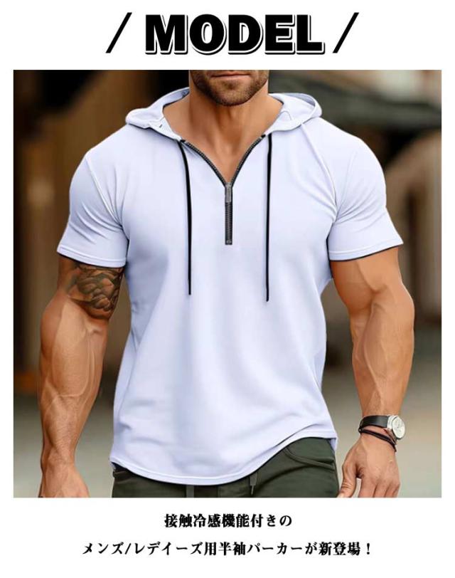 | 接触冷感機能付きのメンズ/レデイーズ用半袖パーカーが新登場!こちらのパーカーは、夏の暑い日にぴったりのアイテムです。 吸水速乾素材が使用されており、汗をかいてもドライな着心地をキープします。 さらに、UV対策も兼ね備えているので、日差しの強い海水浴場やプールサイドでの着用にもお勧めです。 快適な素材と機能性を備えたこのパーカーは、アクティブな夏のアウトドアシーンで活躍すること間違いありません。 | |