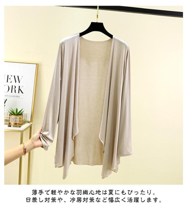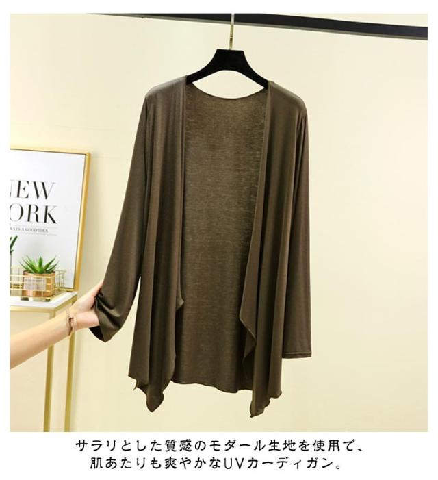 | 無地でシンプルなデザインがデイリー使いしやすいカーディガンです。 サラリとした質感のモダール生地を使用で、肌あたりも爽やかなUVカーディガン。 長すぎないロング丈で、身長を問わず着こなせる程よい丈感が、ポイントです。 薄手で軽やかな羽織心地は夏にもぴったり。日差し対策や、冷房対策など幅広く活躍します。 | |