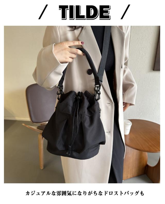 | ころんと丸みのあるフォルムが可愛い 2wayドロストバッグ カジュアルな雰囲気になりがちなドロストバッグも 落ち着いたカラーとデザインでキレイめも叶う メイン収納にプラスして、前ポケットが2つあり すぐ取り出したいものも整理して収納できます 長さの違う2種類のストラップは、それぞれ付け外し可能なので、 スタイリングや使い方に応じて ハンドバッグから斜め掛けまで調整できます。 | |