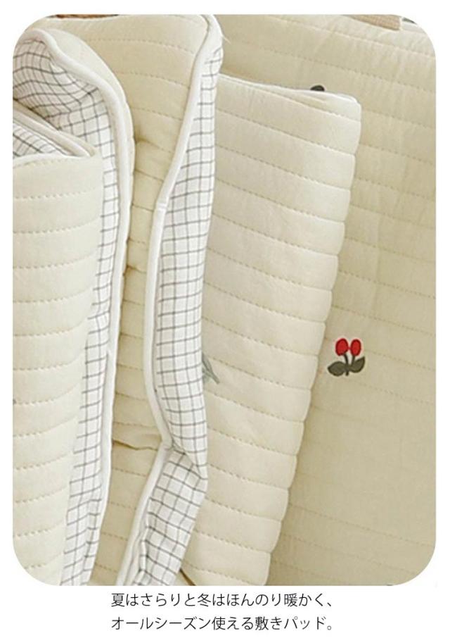 | もこもことしたキルティング生地が可愛い、赤ちゃん用の敷きパッド。 赤ちゃんの快適な眠りをサポートするコットン素材。 折りたたんで持ち運べるコンパクト設計。 洗濯機で丸洗い可能でお手入れ簡単。 夏はさらりと冬はほんのり暖かく、オールシーズン使える敷きパッド。 吸水性が良いので赤ちゃんがたくさん汗をかいてもベタつかず、ぐっすり快適に眠れます。 | |