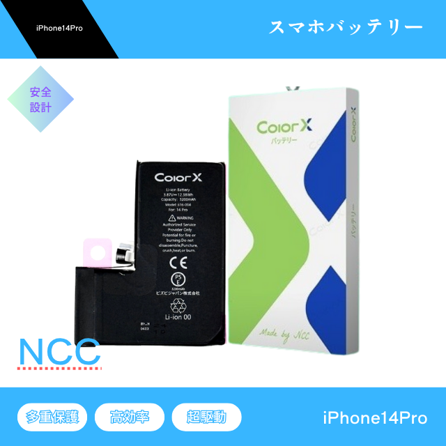 iPhone14Pro バッテリー NCC ColorX 交換 互換 バッテリー 防水シート バッテリーステッカー PSE取得