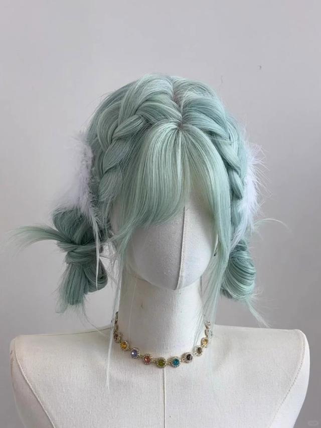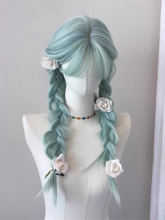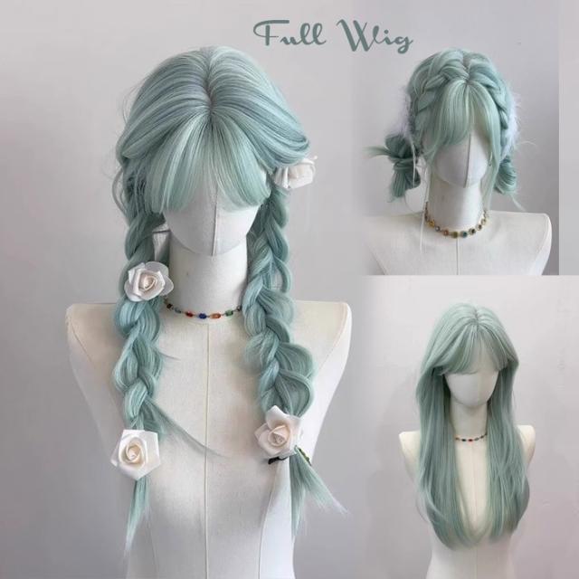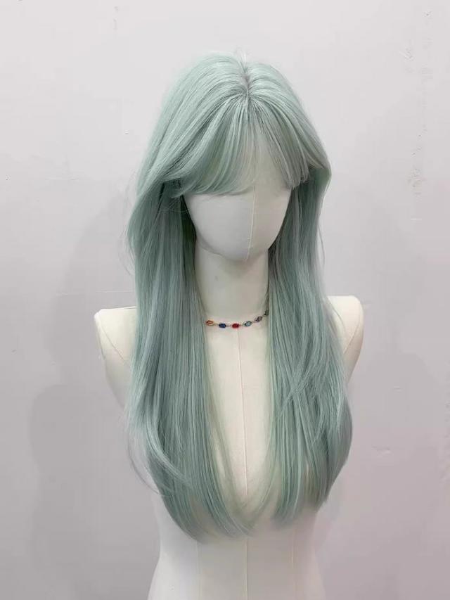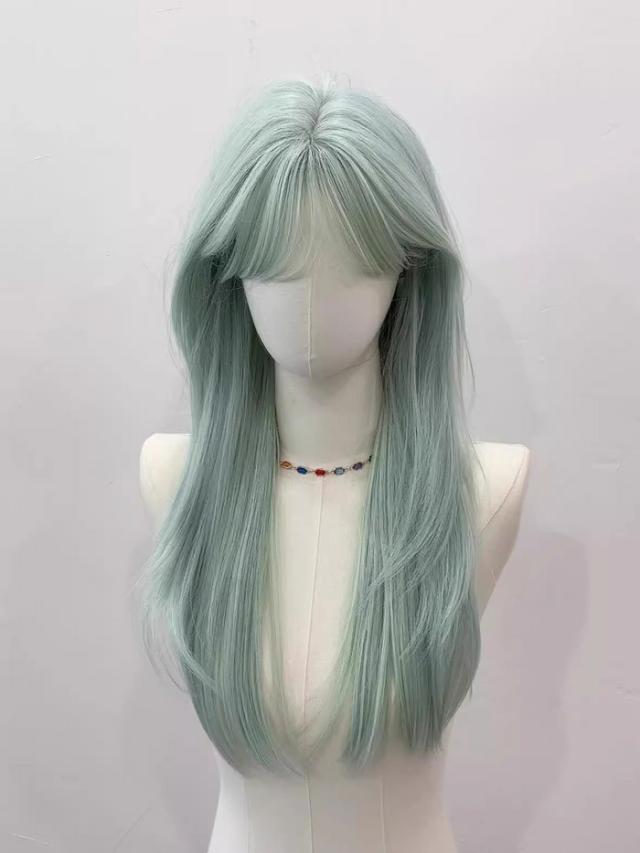 ウィッグ フルウィッグ ロング ミントグリーン 耐熱 編み込み可 前髪あり 自然 3スタイル対応 コスプレ ファッション