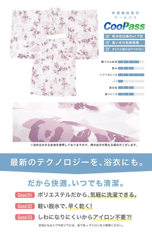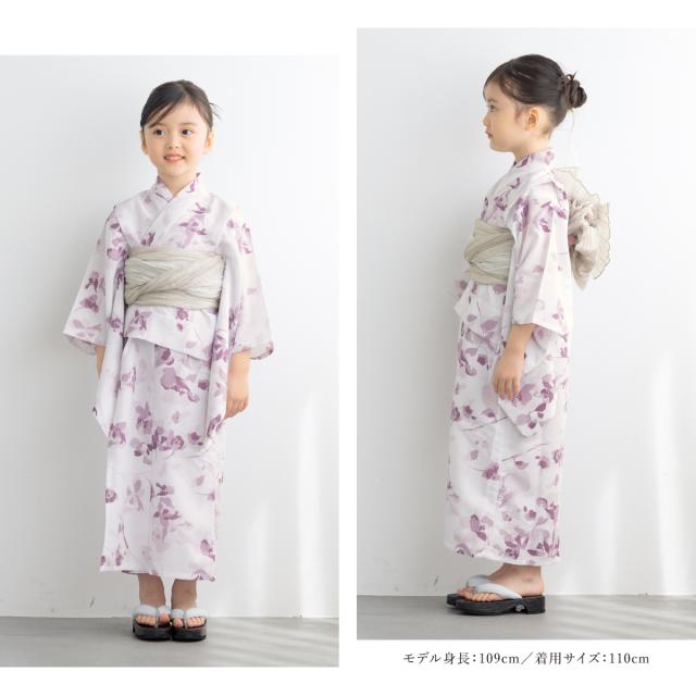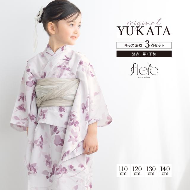 浴衣 女の子 浴衣セット キッズ 子供 兵児帯 3点セット floro 白 紫 ピンク ベージュ 吸水速乾 花柄 おしゃれ かわいい 帯 下駄 110cm 120cm 130cm 140cm 送料無料