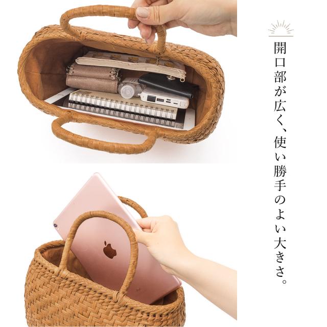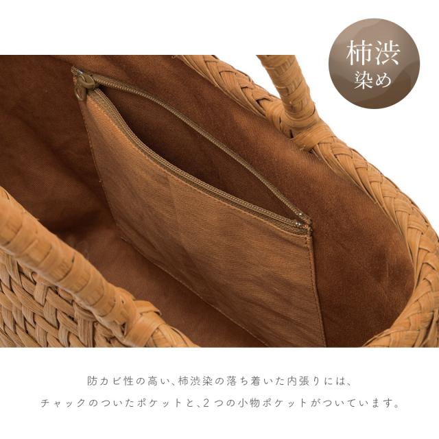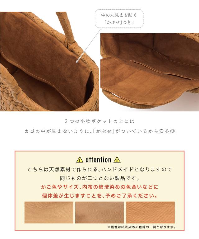※こちらは天然素材で作られるハンドメイドとなりますので、同じものが二つとない製品です。かご色やサイズ、内布の柿渋染めの色合いなどにも個体差があります。予めご了承ください。